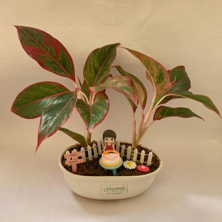 Aglaonema in a ceramic tray with miniatures.