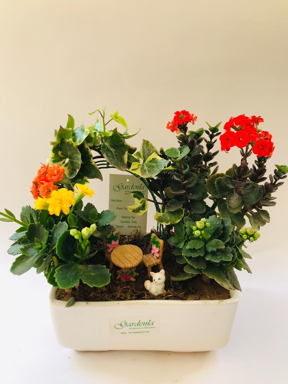 Colorful Kalanchoe and English Ivy in a ceramic tray with miniatures.