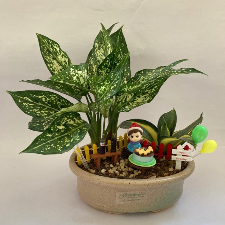Indoor plants in a beautiful ceramic tray with miniatures. A tray designed on a boy's birthday party theme. Get it customized for your theme.