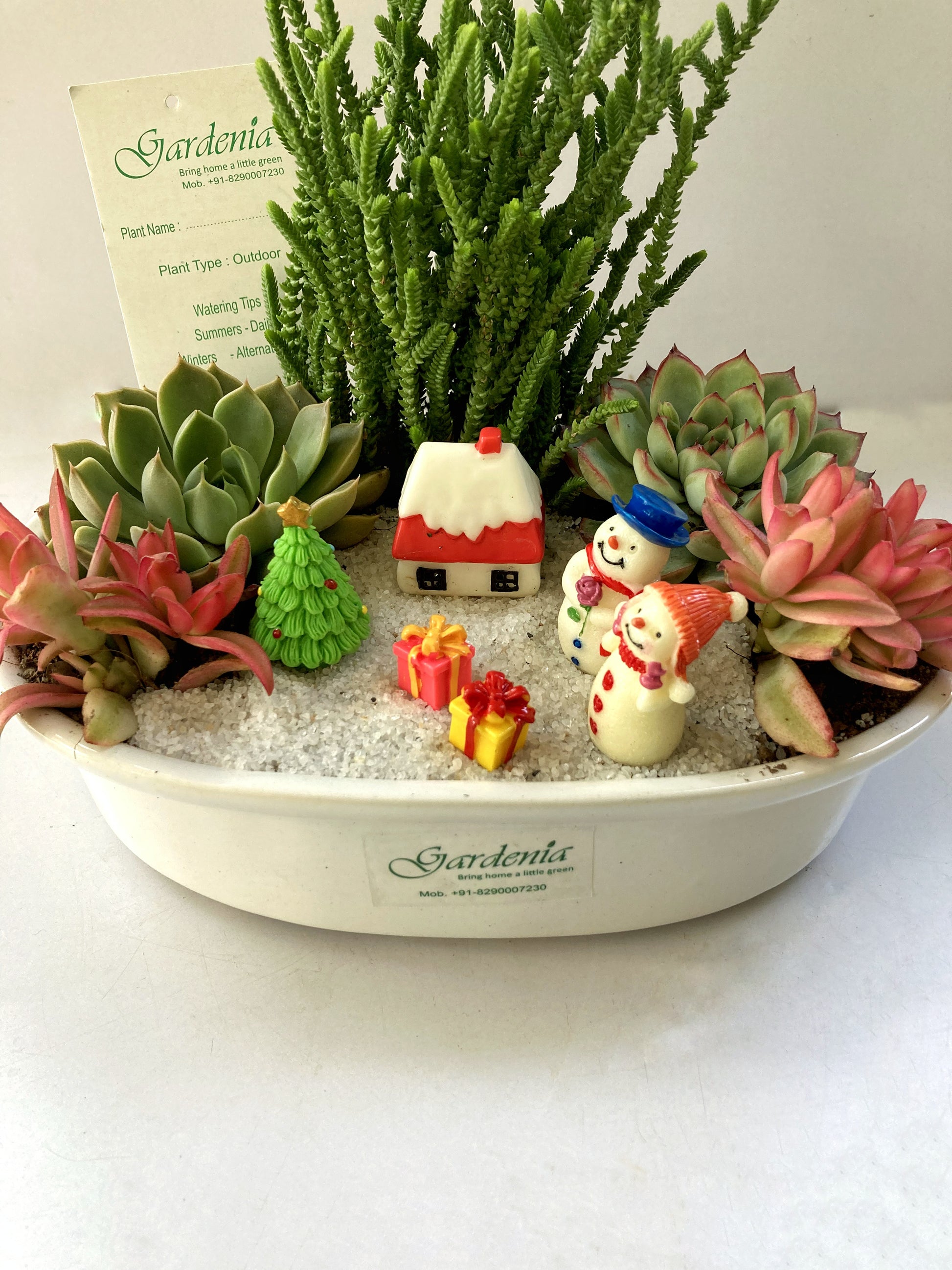 This holiday season, express your love by gifting a Christmas theme tray garden with miniature snowman, house, giftboxes, and Christmas tree, all surrounded by a lovely display of succulent around the house.