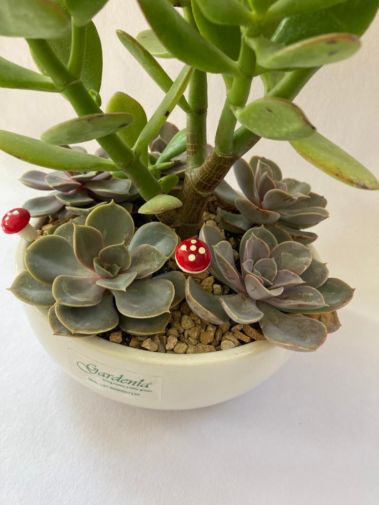 Color of the pot, succulents, and miniatures may vary as per the availability. For any customization, contact us on +91-8290007230