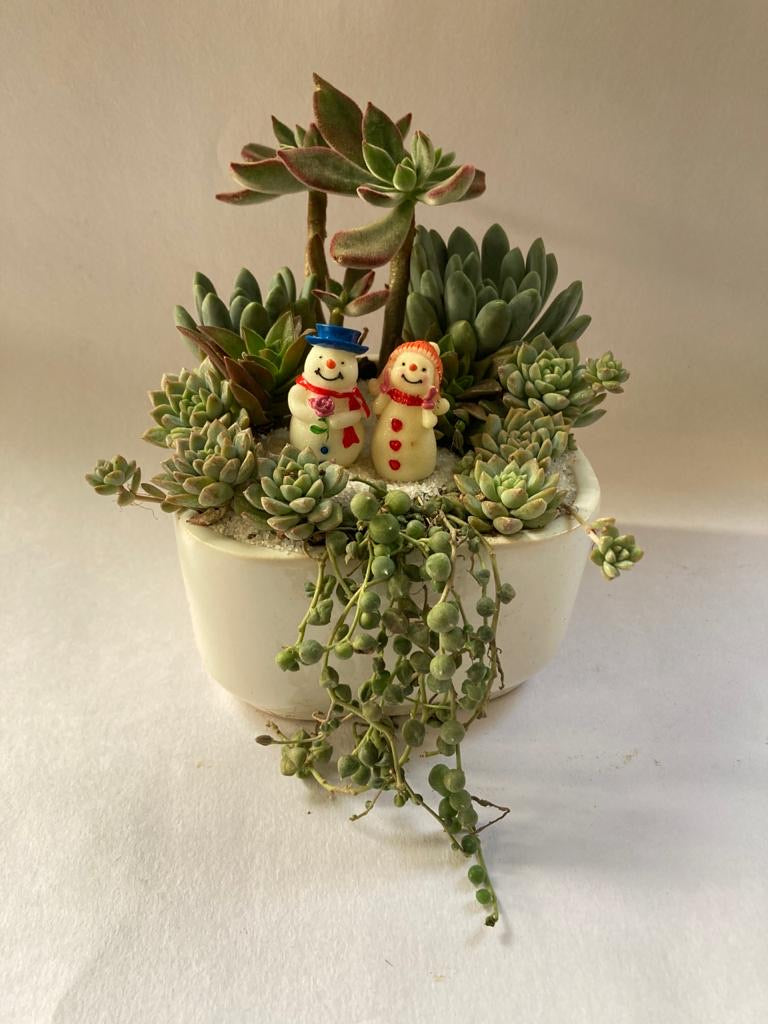 Snow and Snowman are the harbingers pointing that winter is coming. With a variety of succulents, this tray is a perfect gift symbolizing the winter holiday season.