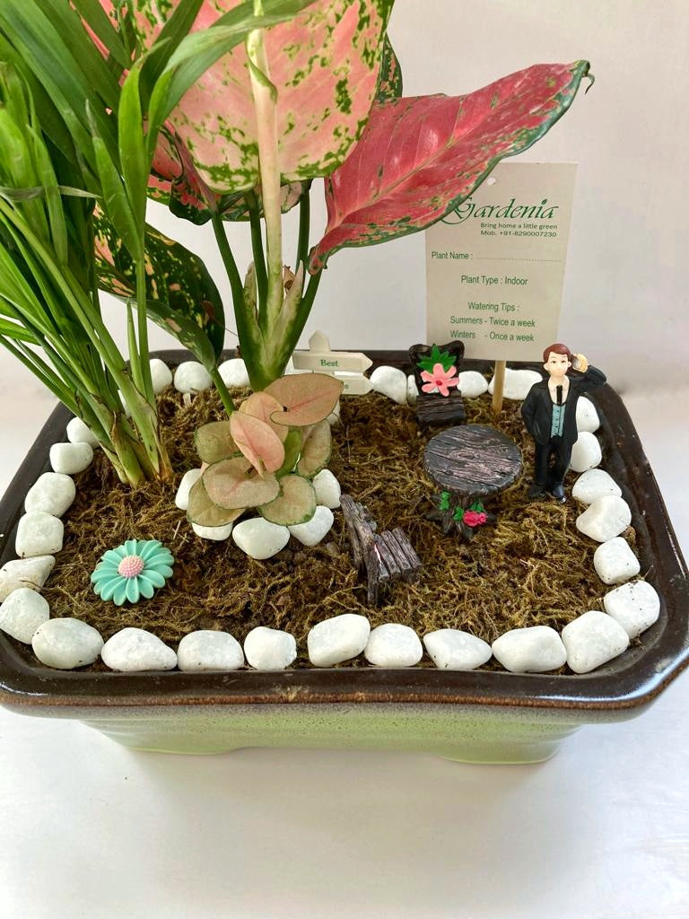 Special tray for the most special men in our lives, with Syngonium (also called Arrowhead) with attractive heart-shaped leaves and Aglaonema (or Chinese Evergreens) bringing good fortune and purifying air under low water and light requirements.